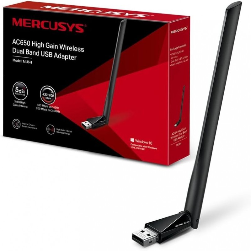 Mercusys TP-Link MU6H Adattatore AC650 WiFi USB ad Alto Guadagno, Chiavetta WiFi, Dual-Band, 200 Mbps su 2.4GHz con Tecnologia 256-QAM, 433Mbps su 5GHz, Compatibile con Windows 11/10/8.1/8/7/XP.