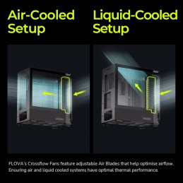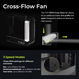 La ventola TCF integra tre modalità operative selezionabili tramite switch fisico: Eco mode (silent, fino a ~1000 RPM stimato), Performance mode (bilanciato, fino a 1800 RPM) e Over-Drive mode (max cooling, fino a 2500 RPM). Le "Air Blades" direzionali regolabili permettono di orientare manualmente il flusso verso zone specifiche, ottimizzando cooling per layout hardware custom. Il sistema di raffreddamento complessivo supporta configurazioni estremamente flessibili: radiatori fino a 360mm in posizione top (con clearance sufficiente per installazione push-pull), radiatori fino a 280mm sul pannello laterale (nota: interferenza con TCF richiede posizione tubing specifica), ventole da 120/140/160/180/200mm in posizione frontale, 2× 120mm sul pannello base, più la TRYX ROTA 120mm pre-installata come exhaust posteriore. Il supporto multi-format per ventole è particolarmente apprezzato per builder che vogliono massimizzare airflow con configurazioni custom o che possiedono ventole premium esistenti di dimensioni non-standard.