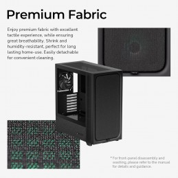 La costruzione privilegia accesso tool-free: tutti i pannelli utilizzano clip a sfera con socket rapidi che permettono rimozione/installazione senza cacciaviti, velocizzando manutenzione e pulizia. I pannelli fabric mesh frontale e laterale inferiore sono realizzati in tessuto tecnico resistente a umidità e restringimento, fornendo filtrazione polvere superiore rispetto a mesh metallico tradizionale pur mantenendo resistenza al flusso d'aria minima. Il vetro temperato sul pannello laterale principale offre visibilità sui componenti interni. Internamente, il layout offre 58 litri di capacità con compatibilità per schede madri Mini-ITX, Micro-ATX, ATX standard e ATX back-connect (12VHPWR/24-pin dietro motherboard tray), 40mm di spazio dietro il tray per cable management pulito con velcro strap inclusi, 7 slot PCIe e clearance GPU fino a 420mm (con TCF rimossa) o 360mm (con TCF installata — configurazione standard). Il compartimento PSU inferiore supporta alimentatori ATX fino a 200mm di lunghezza. Lo storage include 2× bay 3.5" e 4× mount 2.5" (cage removibili per prioritizzare PSU clearance o airflow). Il pannello I/O frontale bottom-mounted include 1× USB 3.2 Gen 2×2 Type-C 20Gbps, 2× USB 3.2 Gen 1 Type-A 5Gbps, 1× combo audio jack e power button. Dimensioni esterne 240×501×481mm (W×H×D) lo rendono compatibile con la maggior parte delle configurazioni desk standard pur offrendo volume interno generoso.