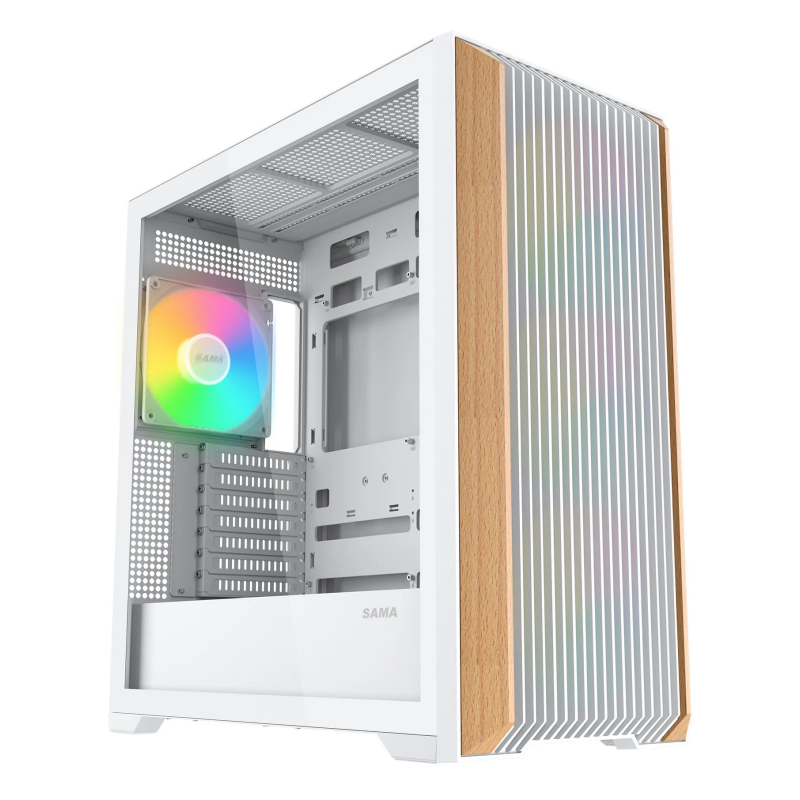 Il SAMA Gears Z60 si distingue per il suo design minimalista e pulito, caratterizzato da un elegante colore bianco che conferisce un aspetto sofisticato. La struttura è realizzata con materiali di alta qualità, garantendo robustezza e durabilità nel tempo. Il pannello laterale in vetro temperato permette di esporre l’hardware interno, offrendo una vista completa dei componenti illuminati e personalizzati. La facciata anteriore presenta un design sobrio con griglie di ventilazione integrate, ottimizzando il flusso d’aria senza compromettere l’estetica. Le dimensioni di 23.5cm di larghezza, 49.6cm di altezza e 48cm di profondità lo rendono un case compatto ma spazioso, ideale per chi cerca un equilibrio tra dimensioni e capacità interna.