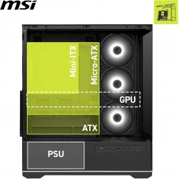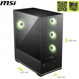 MSI MAG PANO 110R PZ. Fattore di forma: Midi Tower, Tipo: PC, Colore del prodotto: Nero. Posizione alimentazione: Fondo, Fattori di forma di alimentazione supportati: ATX. Ventole laterali installate: 3x 120 mm, Diametro delle ventole laterali supportato: 120,140 mm, Rear fans installed: 1x 120 mm. Dimensioni di hard disk drive supportati: 2.5,3.5". Larghezza: 225 mm, Profondità: 420 mm, Altezza: 485 mm