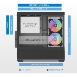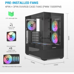 Vista panoramica in vetro temperato a 270°: mostra la tua struttura con doppi pannelli in vetro temperato che offrono una vista panoramica a 270° dei componenti illuminati RGB, perfetta per gli appassionati che desiderano mostrare la loro configurazione personalizzata del PC con stile