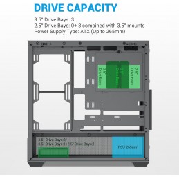 Opzioni di archiviazione flessibili: può ospitare fino a 3 HDD (3,5") o 3 SSD (2,5"), con configurazioni ibride come 2 HDD + 2 SSD o 1 HDD + 3 SSD, soddisfacendo diverse esigenze di archiviazione per configurazioni di gioco e build di produttività.