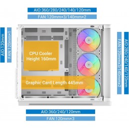 Nonostante le dimensioni compatte, il SAMA V60 offre un’ampia compatibilità con una vasta gamma di componenti. Supporta schede madri ATX, Micro-ATX e Mini-ITX, offrendo flessibilità nella scelta della piattaforma. Lo spazio interno generoso permette di ospitare GPU fino a 445mm di lunghezza, dissipatori CPU fino a 160mm di altezza e alimentatori ATX fino a 210mm di lunghezza. Il supporto per radiatori AIO fino a 360mm offre ulteriori opzioni di raffreddamento per i sistemi più esigenti. Gli slot di espansione multipli consentono di installare schede aggiuntive e periferiche, mentre i supporti per unità da 3,5″ e 2,5″ offrono spazio sufficiente per l’archiviazione dei dati. Questa ampia compatibilità e flessibilità di configurazione rendono il SAMA V60 ideale per una vasta gamma di applicazioni, dai sistemi gaming di fascia alta alle workstation professionali.