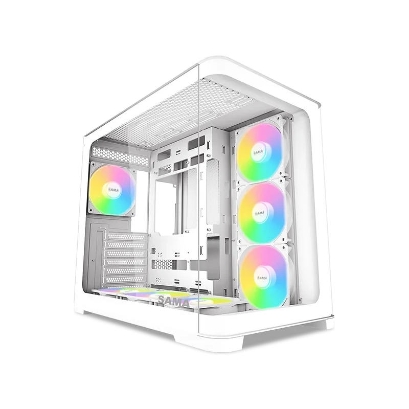 Il SAMA V60 è un case mid-tower ATX che combina un’estetica premium con un flusso d’aria eccezionale. Dotato di doppi pannelli in vetro temperato curvo, offre una vista panoramica impareggiabile sui componenti interni, permettendo di esibire con orgoglio configurazioni di fascia alta e illuminazione RGB personalizzata. Le 7 ventole ARGB PWM preinstallate, strategicamente posizionate per massimizzare il raffreddamento, e l’hub per ventole incluso garantiscono un controllo termico ottimale. La compatibilità con radiatori AIO fino a 360mm offre flessibilità di raffreddamento sia per sistemi ad aria che a liquido. Nonostante le dimensioni compatte, il V60 offre ampio spazio interno per ospitare componenti di grandi dimensioni, rendendolo ideale per configurazioni gaming e workstation di alto livello.