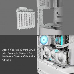 Uno degli elementi più innovativi è il supporto GPU rotabile, che consente l’installazione della scheda grafica in posizione verticale fino a 450 mm o orizzontale fino a 420 mm. Inoltre, la struttura interna leggermente inclinata (tilt di circa 5°) migliora la circolazione dell’aria e dona un look dinamico all’intero case. Il sistema include numerosi filtri antipolvere magnetici, supporti per radiatori fino a 360 mm, gestione avanzata dei cavi e abbondante spazio per PSU e unità di storage, rendendolo una soluzione completa per gamer, modder e appassionati.