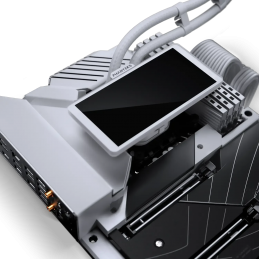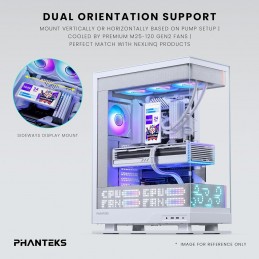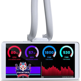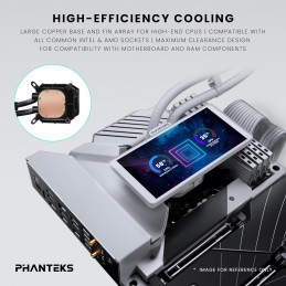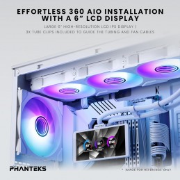 Il display LCD6-HD da 145,2 × 70,5 mm con pannello IPS offre una luminanza di 250 nit e supporta sette posizioni di orientamento regolabili, sia in modalità landscape che portrait, per adattarsi a qualsiasi configurazione di case e garantire sempre la massima leggibilità. Il design della testa pompa è stato ottimizzato per offrire 51 mm di clearance RAM, compatibile con moduli di memoria RGB anche di grandi dimensioni. Il connettore del display è USB-C, collegato alla scheda madre tramite il cavo USB-C → USB 2.0 internal header da 600 mm incluso in confezione. Il sistema di illuminazione D-RGB integrato nel blocco pompa utilizza un design a infinity mirror per un effetto visivo di profondità illimitata, gestibile tramite controller Phanteks o header A-RGB compatibili ASUS/MSI.