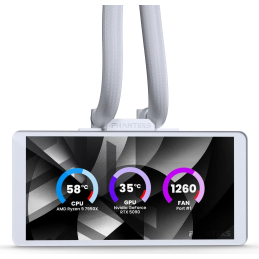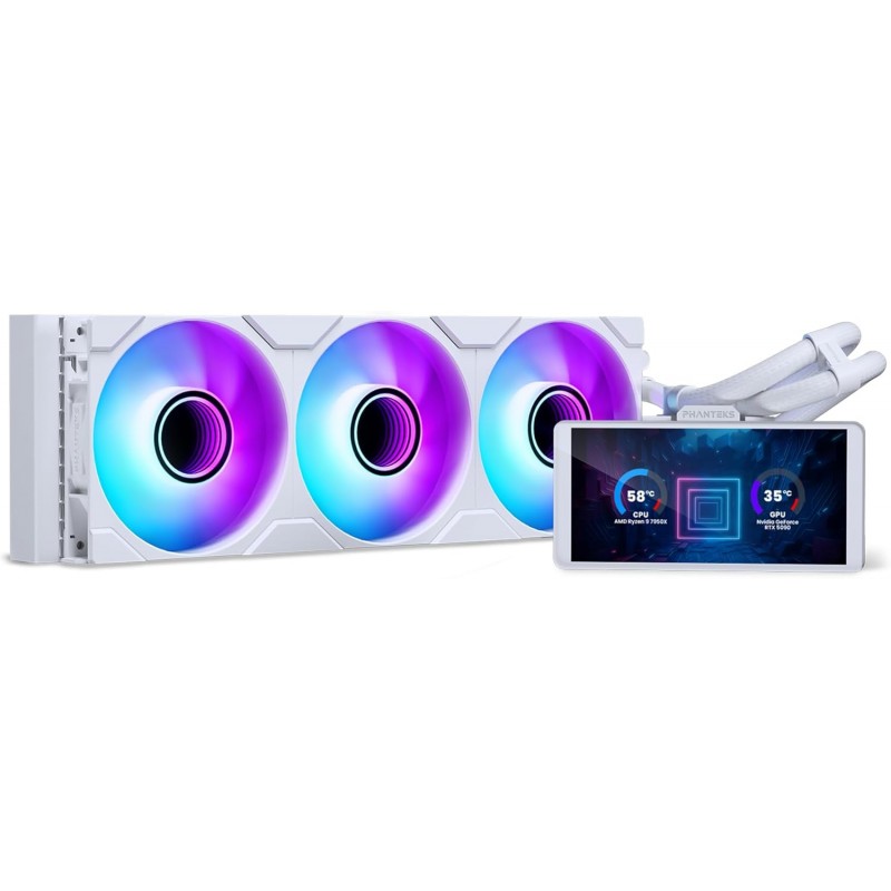 Il Phanteks Glacier One 360M25 LCD è un dissipatore a liquido all-in-one da 360mm che integra un imponente display LCD-IPS da 6 pollici direttamente nel blocco pompa, portando la personalizzazione visiva a un livello inedito per questa categoria di prodotti. Progettato per raffreddare le CPU di fascia alta con efficienza e silenziosità, combina un radiatore ad alte prestazioni con tre ventole M25 Gen2 D-RGB e un pannello da 1.480 × 720 pixel a 60 Hz che trasforma il blocco pompa in un centro di controllo visivo personalizzabile. Il display opera direttamente a livello hardware, senza gravare sulle risorse del processore, e può mostrare in tempo reale telemetria di sistema, temperature, velocità di clock, orario e contenuti multimediali attraverso la NexLinq App per Windows.